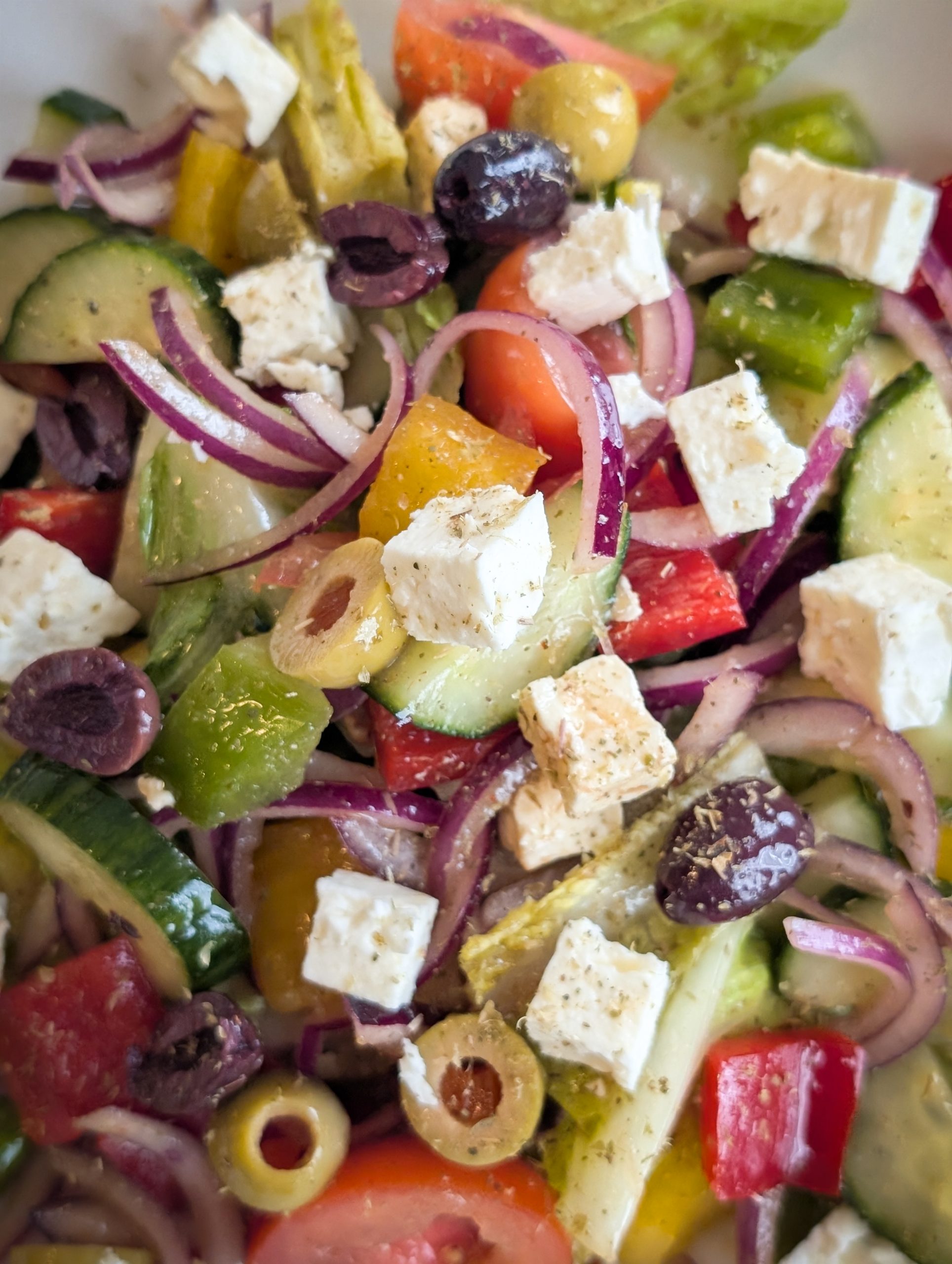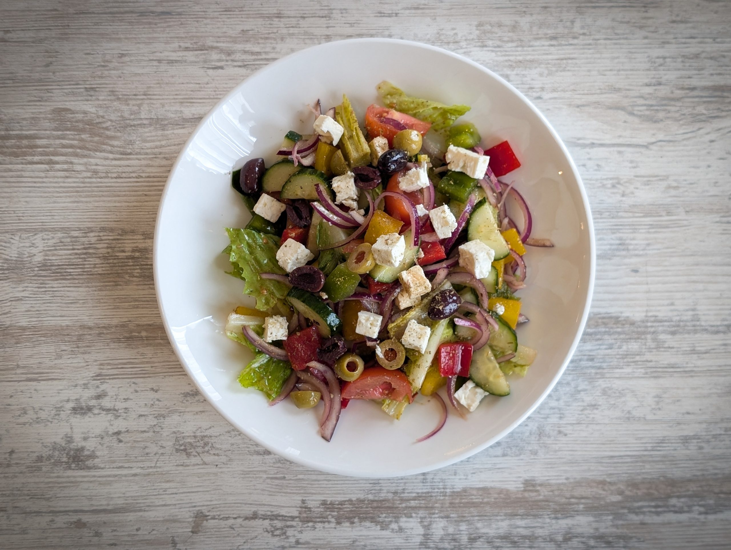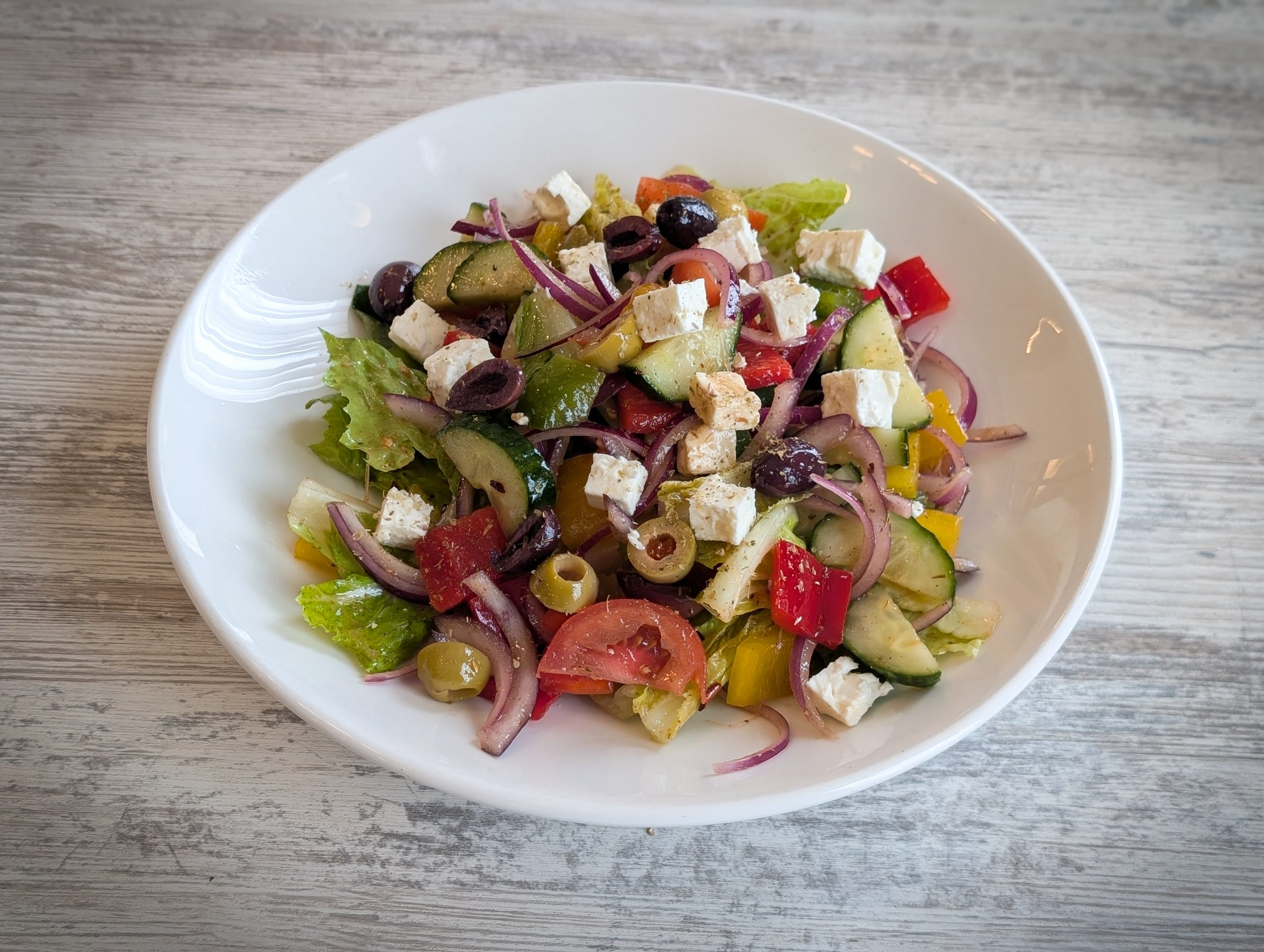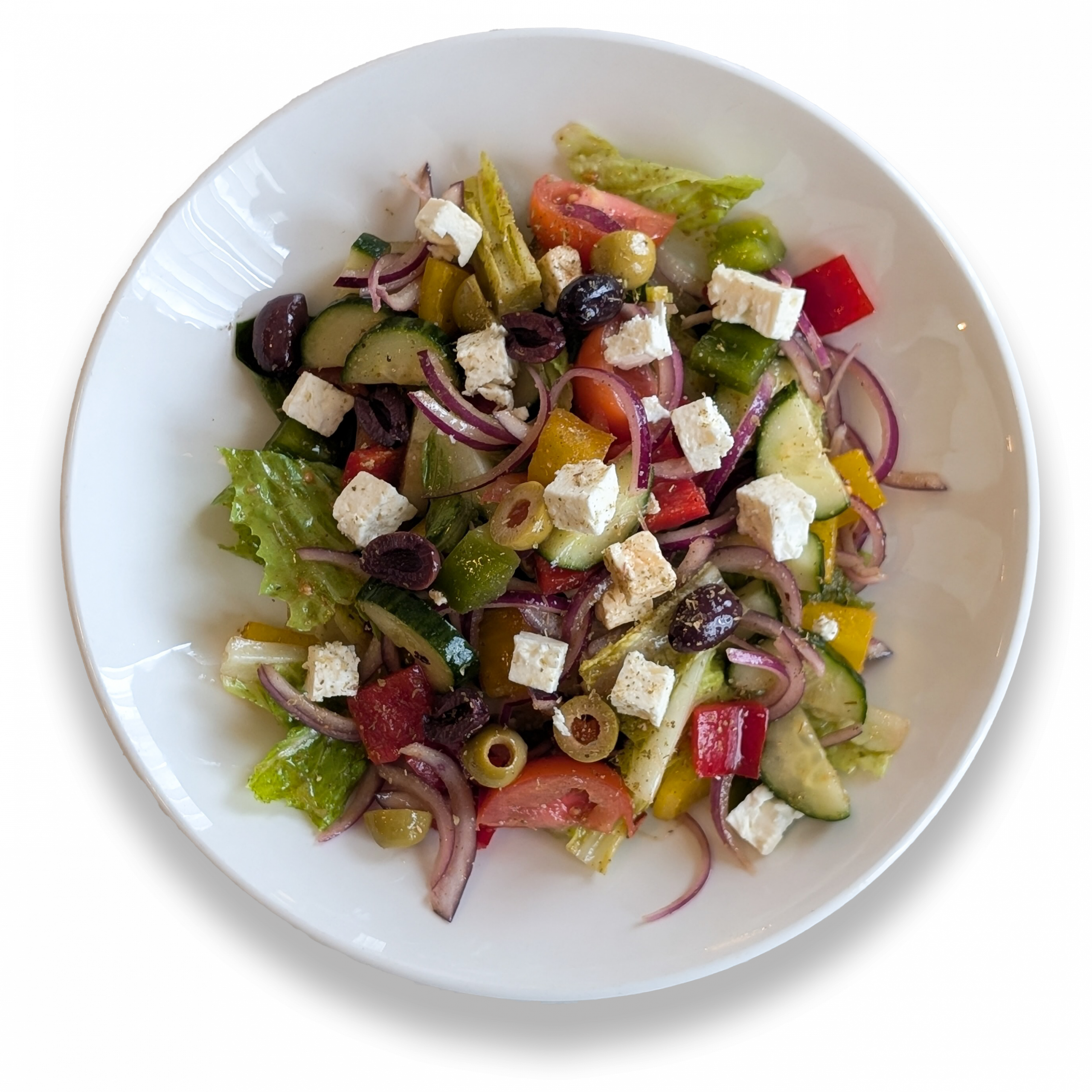 Cucumber, Tomato, Onion, Peppers, Romaine, Feta, Olives, Lemon Dressing